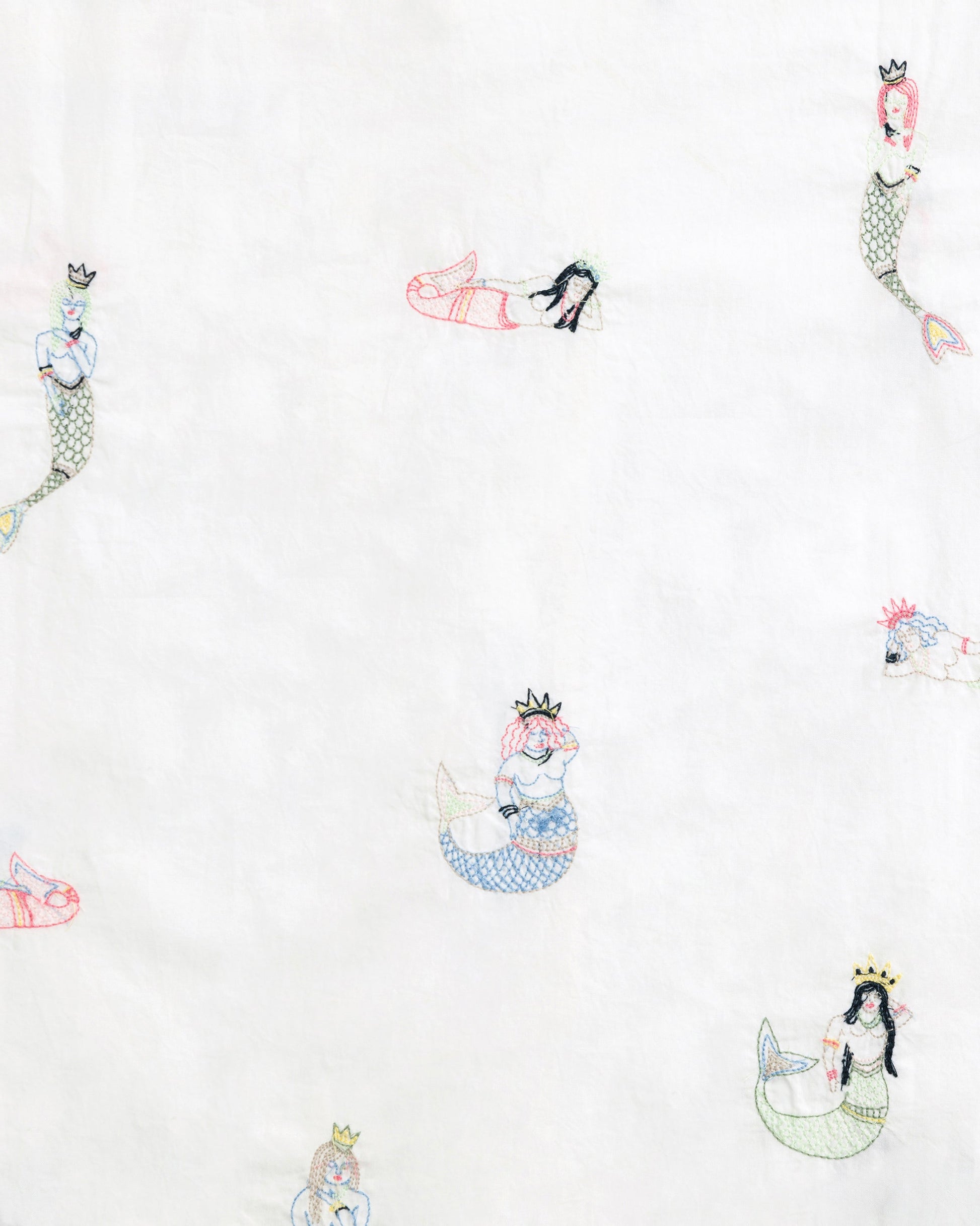 - The Pattern: Mermaids come in all shapes and sizes, just like we do. Symbolizing renewal and revitalization thanks to their ties to the water, these embroidered pajamas were inspired by a desire to unwind and reach a place of rest and relaxation. The unique beauty of these under-the-sea beings is reflected in the quirky illustrations embroidered across the design.