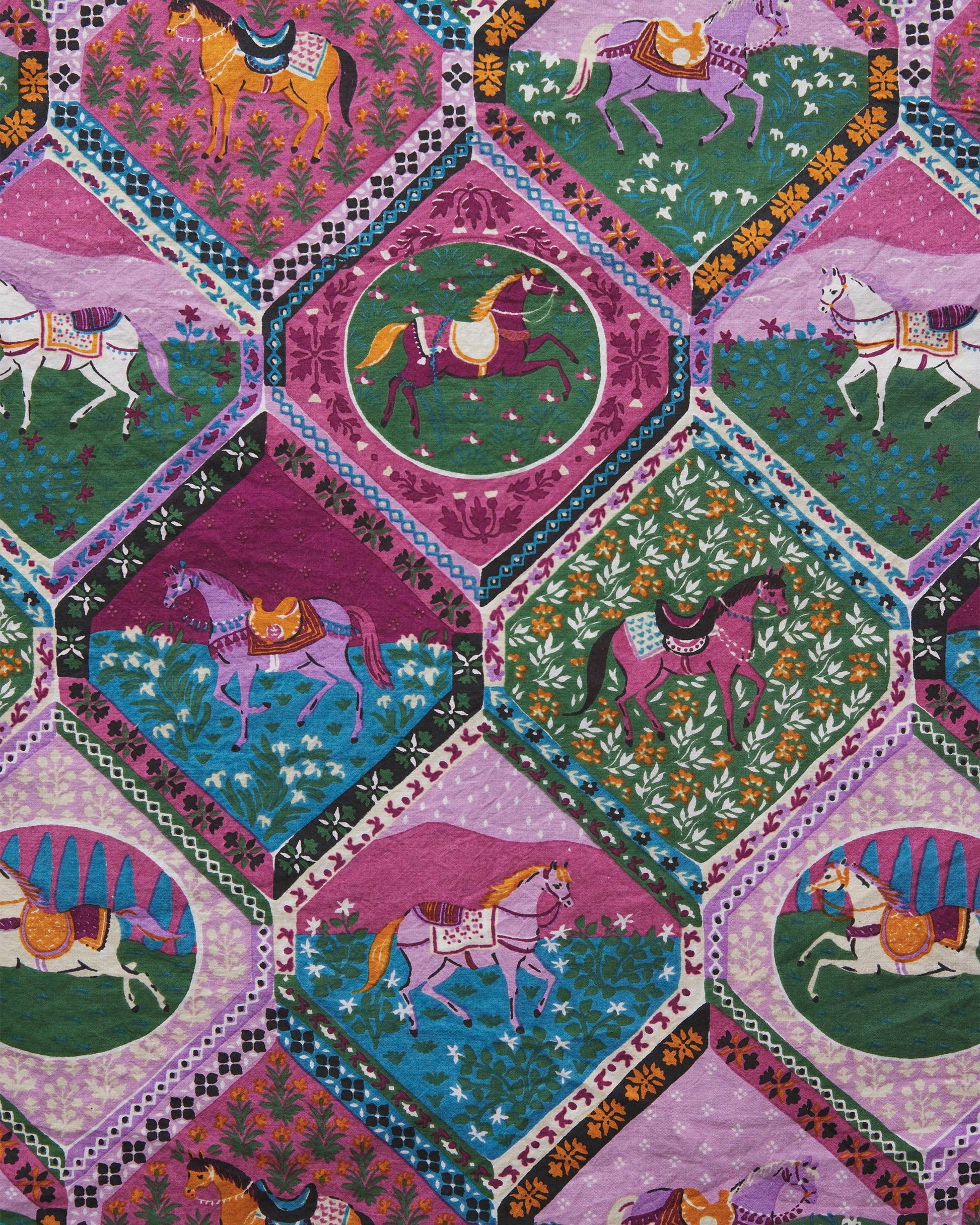 The Pattern: After years of wanting to create a print adorned with stylized horses, we took the reins to design this folkloric pattern reminiscent of a fanciful fall. Featuring storybook-inspired steeds in framed vignettes, this colorful artwork is best worn lounging inside or during walks to the stable. Learn more about the print here!