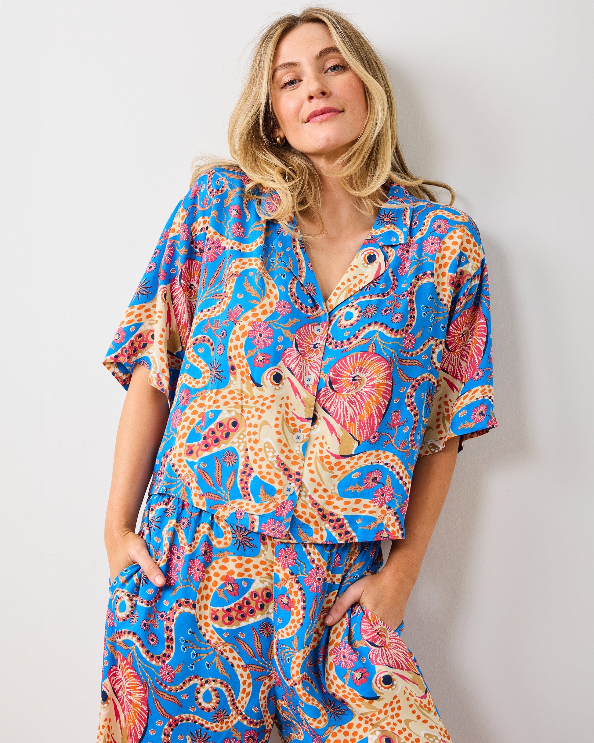 - The Pattern: The Octopus Isle collection brings a bold, oceanic allure to Eco Satin sleepwear with its striking kraken-like octopuses weaving through deep-sea blues and swirling currents. This silky, sustainable fabric drapes effortlessly, blending mystery and elegance with a touch of nautical drama. Perfect for those who dream of uncharted waters, Octopus Isle is where coastal charm meets fearless adventure.